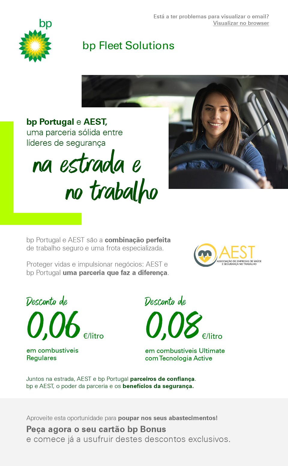A BP Portugal e a AEST aliaram-se e fruto dessa parceria, todos os Associados e os seus colaboradores, podem beneficiar da utilização de Cartões BP Bónus associados à AEST. As empresas associadas devem comunicar com todos os colaboradores esta ação e encaminhar para a AEST, todos os interessados ou as próprias empresas, que forem pretendendo obter
