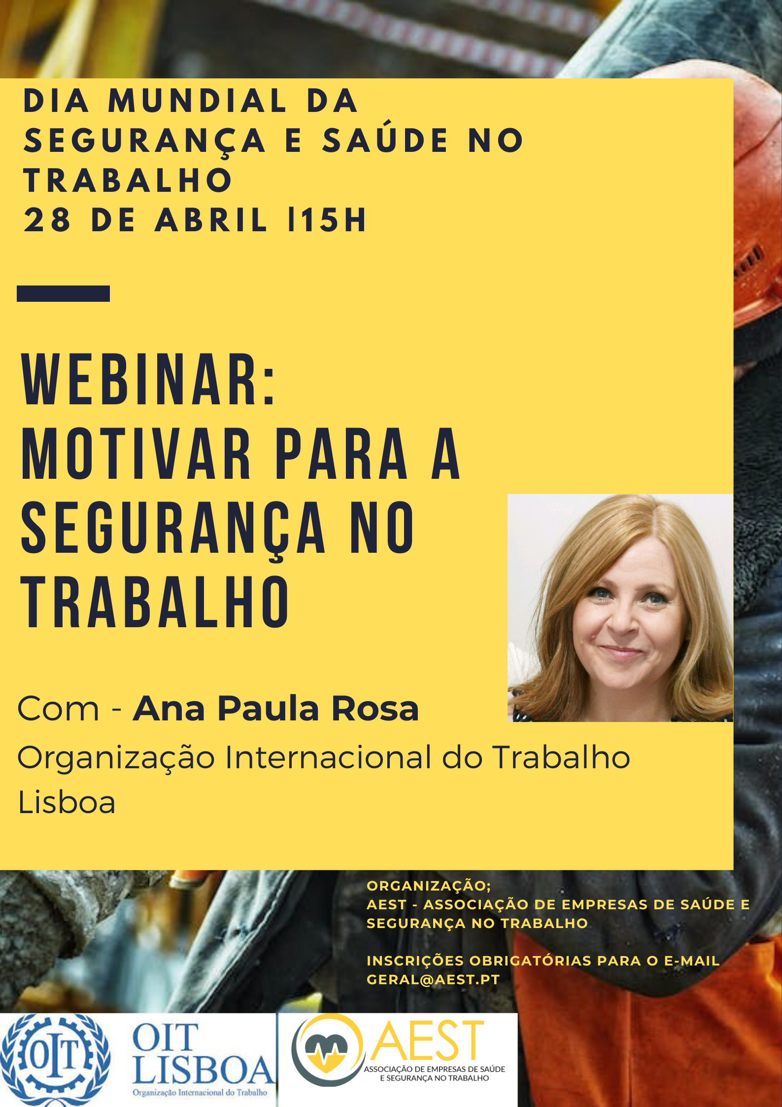 A AEST numa parceria com a Organização Internacional do Trabalho, realiza a 28 de abril, um WEBINAR sobre a motivação para a Segurança no Trabalho. Para assinalar o Dia Mundial da Segurança e Saúde no Trabalho, a OIT escolheu este ano como tema, “ Um ambiente de Trabalho Seguro e Saudável é um Direito Fundamental”.