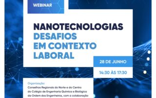28 de junho, das 14:30 às 17:30. Este webinar será organizado pelos Conselhos Regionais do Norte e do Centro do Colégio de Engenharia Química e Biológica da Delegação da Ordem dos Engenheiros, com a colaboração da Comissão Técnica CT194 - Nanotecnologias. Com este Webinar pretende-se dar a conhecer os desafios e oportunidades em contexto laboral
