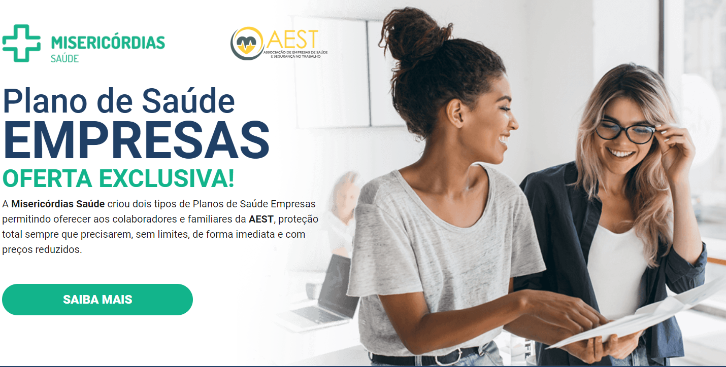 A AEST em parceria com a Misericórdias Saúde, proporciona aos seus associados uma oferta única. Conheça o plano de saúde que se adapta aos seus colaboradores e familiares, podendo tornar-se gratuito e ainda liberta saldo positivo para a sua empresa. Carregue no link abaixo para saber mais e garanta o bem-estar da sua equipa e o sucesso da