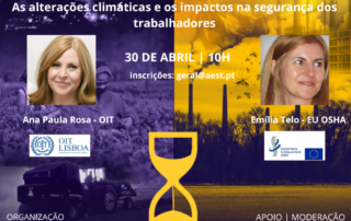 As alterações climáticas e os impactos na segurança dos trabalhadores A AEST - Associação de Empresas de Saúde e Segurança no Trabalho, irá realizar no próximo dia 30 de abril pelas 10h, um webinar no âmbito do "Dia Mundial da Segurança e Saúde no Trabalho" subordinado ao tema, "As alterações climáticas e os impactos na
